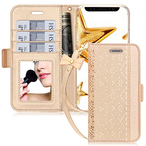iPhone XS ケース iPhone X ケース 手帳型 WWW 透かし彫り模様 高級PUレザー カード収納 マグネット式 スタンド機能 ストラップ付き 鏡付き スマホケース iPhone XS ケース/iPhone X ケース 5.8インチ 対応 ゴールド