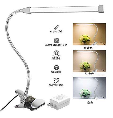 クリップライト led デスクライト 日本語取扱説明書 3段調色(暖色/昼光色/白色) 10段調光 USB式 8W 700lm 80個LED 360°回転 レキシブルアーム 長寿命50000時間 省エネ 明るい 目に優しい 卓上ライト 読書灯 デスクスタンド テーブルライト ナイトライト (銀色)