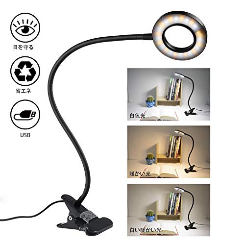 クリップライト LED デスクライト 3階段調色 10階段調光 USB式 8w LEDライト 360°回転 省エネ 明るい 目に優しい 卓上ライト 読書灯 デスクスタンド テーブルライト ナイトライトベッドサイドランプ(黒色)