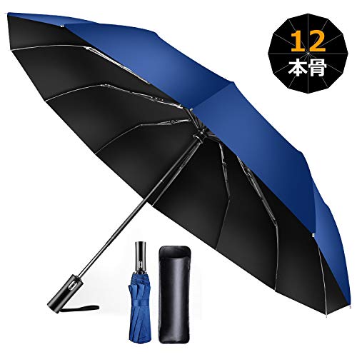 折りたたみ傘 自動開閉【2020強化版 頑丈な12本骨】おりたたみ傘 メンズ 軽量 大きい 超撥水 高強度グラスファイバー ビッグサイズ 日傘 折り畳み傘 レディース 梅雨対策 晴雨兼用 父の日ギフト プレゼント 収納ポーチ付き (ブルー)