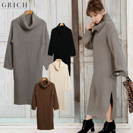 [小顔効果も華奢見えも] [ニット セーター ニットワンピ オフタートル タートル ざっくり ローゲージ スリット] [ワンピース] スリット入りオフタートルニットワンピース [181245]