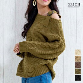 トップス レディース ニット セーター ワンショルダー 肩見せ 肌見せ オフショルダー ざっくり バルキー ローゲージ ケーブル ボリューム袖 ドロップショルダー ドルマン / ケーブル肩ベルトニット [190949]