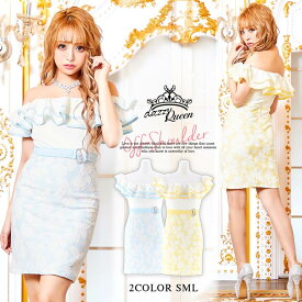 【1000円OFFクーポン&送料無料】 キャバ ドレス ミニ キャバドレス ワンピース ナイトドレス 大きいサイズ コードレース タイト ミニドレス S M L イエロー 青 パステル フリル ベルト 桜井莉菜 レディース 女性 dazzyQueen オフショル フレア袖