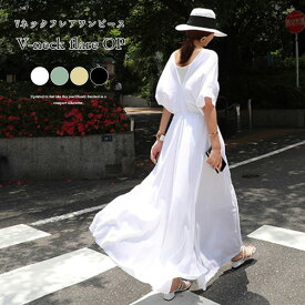 【クーポン利用で40%OFF】 Vネック フレア ワンピース レディース 半袖 5分袖 マキシ丈 ロング丈 Aライン ブラウジング シンプル 大人 きれいめ 可愛い メール便 2020春夏新作 M/L 【lgww-at3420】【予約販売:8月18日入荷予定順次発送】【送料無料】メ込